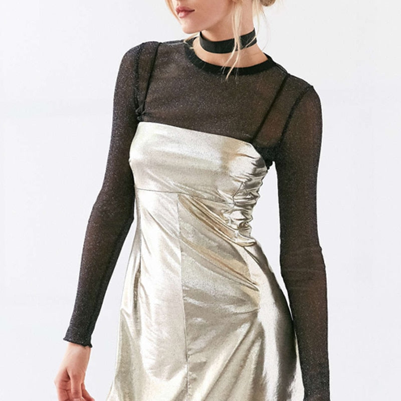 Spring Summer Women's Sexy Black See Through Mesh Blouse Transparent Shining Fitness Shirt Fashion Tops For Party Club